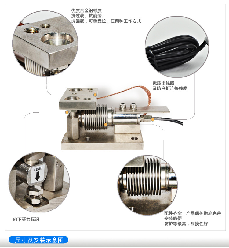 與現(xiàn)成的電子衡器相比,此款稱重模塊最大的特點是不受場地限制,組裝靈活,維修方便且價格便宜。 料斗秤或者料罐秤等稱重工具因有秤臺,要一定的占地面積,而稱重模塊安裝在容器的支承點上,不需另外占地。特別適用于多個容器并列安裝而場地窄小的場合。電子衡器的量程和分度值有一定的規(guī)格,而稱重模塊組成的稱重系統(tǒng),量程和分度值可以在儀表允許的范圍內(nèi),根據(jù)需要自行設(shè)置。稱重模塊維修方便,若傳感器損壞,可以調(diào)節(jié)支撐螺桿將秤體頂起,不必拆除稱重模塊,就能更換傳感器。另外,由于這款稱重模塊結(jié)構(gòu)簡單,因而由稱重模塊組成稱重系統(tǒng),投資也比較少。